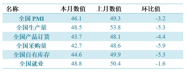 具體觀察各項指標,PMI指標為46.1%,比上月回落3.2個百分點。生產量指標為48.5%,比上月回落5.3個百分點。產品訂貨指標為43.7%,比上月回落4.4個百分點。進口指標為42.1%,比上月回落6.3個百分點。自有庫存指標為44.6%,比上月回落5.3個百分點。就業(yè)指標為48.8%,比上月回落1.6個百分點。