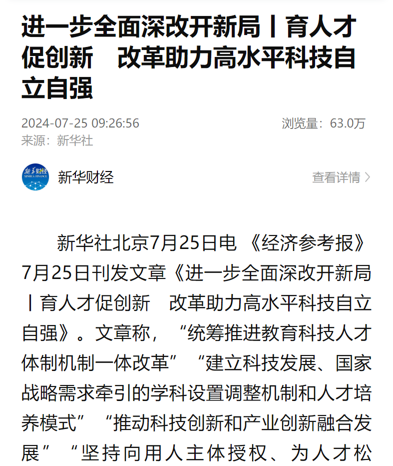 黨的二十大報告首次將教育、科技、人才合為一個部分作出專章部署,而從三中全會公報來看,教育科技人才體制機制改革單列一段,提出必須深入實施科教興國戰(zhàn)略、人才強國戰(zhàn)略、創(chuàng)新驅動發(fā)展戰(zhàn)略,統(tǒng)籌推進教育科技人才體制機制一體改革,健全新型舉國體制,提升國家創(chuàng)新體系整體效能。