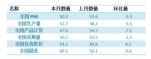 具體觀察各項(xiàng)指標(biāo),PMI指標(biāo)為50.3%,比上月回落3.3個(gè)百分點(diǎn)。生產(chǎn)量指標(biāo)為52.7%,比上月回落5.5個(gè)百分點(diǎn)。產(chǎn)品訂貨指標(biāo)為47.6%,比上月回落7.1個(gè)百分點(diǎn)。進(jìn)口指標(biāo)為40.3%,比上月回落2.4個(gè)百分點(diǎn)。自有庫存指標(biāo)為54.1%,比上月回升4.5個(gè)百分點(diǎn)。就業(yè)指標(biāo)為49.5%,比上月回落0.6個(gè)百分點(diǎn)。