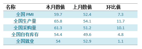 具體觀察各項(xiàng)指標(biāo),PMI指標(biāo)為59.7%,比上月回升7.3個(gè)百分點(diǎn)。生產(chǎn)量指標(biāo)為65.8%,比上月回升11.7個(gè)百分點(diǎn)。產(chǎn)品訂貨指標(biāo)比上月回升12.9個(gè)百分點(diǎn)。自有庫存指標(biāo)為54.4%,比上月回升4.8個(gè)百分點(diǎn)。就業(yè)指標(biāo)為54%,比上月回升1.1個(gè)百分點(diǎn)。