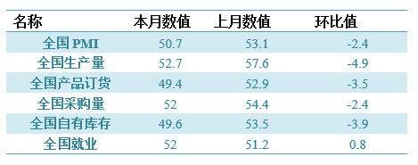 具體觀察各項指標,PMI指標為50.7%,比上月回落2.4個百分點。生產(chǎn)量指標為52.7%,比上月回落4.9個百分點。產(chǎn)品訂貨指標為49.4%,比上月回落3.5個百分點。進口指標為45.7%,比上月回落3.3個百分點。自有庫存指標為49.6%,比上月回落3.9個百分點。就業(yè)指標為52%,比上月回升0.8個百分點。