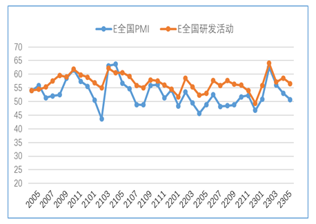 中采咨詢于穎認為:“2023年5月,需求集中釋放結(jié)束疊加淡季來臨,新興產(chǎn)業(yè)EPMI回落2.4個百分點至50.7%,三個月均值亦回落,落實上月預判。各正向指標回落,產(chǎn)品訂貨與生產(chǎn)量分別回落3.5和4.9個百分點,三個月均值仍在53.5%和56.6%中位,產(chǎn)需擴張放緩,多為季節(jié)性回落。前期積壓訂單完成,現(xiàn)有訂貨連續(xù)三個月回落至46.8%。全球經(jīng)濟周期下行,外需持續(xù)回落,出口大幅回落5.1個百分點至43.4%,進口回落3.3個百分點至45.7%,中國經(jīng)濟韌性強于海外,進口好于出口。自有庫存和用戶庫存同時回落,成品庫存中高位水平將擠壓后期生產(chǎn)空間。研發(fā)活動和新產(chǎn)品投產(chǎn)都小幅回落,但水平高于去年同期,新品穩(wěn)定輸出,科研投入力度溫和;經(jīng)營預期57.5%,高于近年均值。新興產(chǎn)業(yè)的購進價格連續(xù)四個月回落至47%,創(chuàng)2016年以來新低,收費價格亦回落0.8個百分點至45.9%,銷售價格的歷史分位高于購進價格,企業(yè)利潤空間尚可,兩價皆低于近年均值,回撤后未來將應需求而動。貸款難度維持歷史低位,與近年均值差為-5.4%,應收賬款位于58%高位,企業(yè)資金周轉(zhuǎn)順暢。員工薪酬連續(xù)三個月回落至52.7%,為兩年半數(shù)據(jù)的中低位。未來6月為傳統(tǒng)淡季,全球周期亦需磨底,預計下月EPMI數(shù)值小幅回落。”