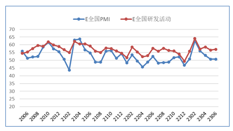 中采咨詢于穎認為:“2023年6月,新興產(chǎn)業(yè)EPMI50.7%,與上月持平,前期環(huán)比波動結束,三個月均值回落;歷史同期干擾因素奇多,從絕對值、分項指標配比看,淡季特征明顯。生產(chǎn)量小幅回升,趨近于長期均值,產(chǎn)品訂貨持平于上月,維持低位。淡季疊加全球周期觸底,出口回落1.5個百分點至41.9%,低于四年均值2.5個百分點;進口觸底回升4.4個百分點至50.1%,高于四年均值3.9個百分點,內需強于外需,進口強于出口。自有庫存回升至四年均值位置,用戶庫存小幅升至中高位但低于去年同期,需求不足銷售受阻,未來生產(chǎn)承壓。經(jīng)營預期回落4.3個百分點至53.4%,低于近兩年同期。購進價格自上月新低后微升0.3個百分點至47.3%,銷售價格回落2.6個百分點至43.3%,是2022年2月以來的新低。銷售價格與購進價格分別低于四年均值7.25和13.49個百分點,銷售價格的歷史分位相對更高,但利潤處收縮狀態(tài)。兩價淡季磨底,連續(xù)回落逼近低閾值,待需求抬升價格。貸款難度連續(xù)4個月處50以下的歷史低位,應收賬款位于55.7%中位,企業(yè)融資環(huán)境寬松,資金流轉順暢。研發(fā)活動和新產(chǎn)品投產(chǎn)分別回升至57.1%和60.5%,均高于四年均值,新品落地速度加快,科研投入持續(xù)加大。淡季正當時,疊加全球周期筑底,預計下月EPMI數(shù)值依舊小幅波動。”