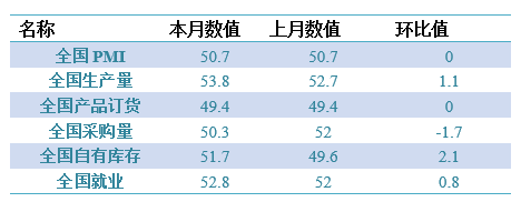 具體觀察各項指標,PMI指標為50.7%,與上月持平生產(chǎn)量指標為53.8%,比上月回升1.1個百分點。產(chǎn)品訂貨指標為49.4%,與上月持平進口指標為50.1%,比上月回升4.4個百分點。自有庫存指標為51.7%,比上月回升2.1個百分點。就業(yè)指標為52.8%,比上月回升0.8個百分點。