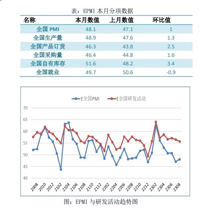 具體觀(guān)察各項(xiàng)指標(biāo),PMI指標(biāo)為48.1%,比上月回升1個(gè)百分點(diǎn)。生產(chǎn)量指標(biāo)為48.9%,比上月回升1.3個(gè)百分點(diǎn)。產(chǎn)品訂貨指標(biāo)為46.3%,比上月回升2.5個(gè)百分點(diǎn)。進(jìn)口指標(biāo)為45.3%,比上月回升2.1個(gè)百分點(diǎn)。自有庫(kù)存指標(biāo)為51.6%,比上月回升3.4個(gè)百分點(diǎn)。就業(yè)指標(biāo)為49.7%,比上月回落0.9個(gè)百分點(diǎn)。