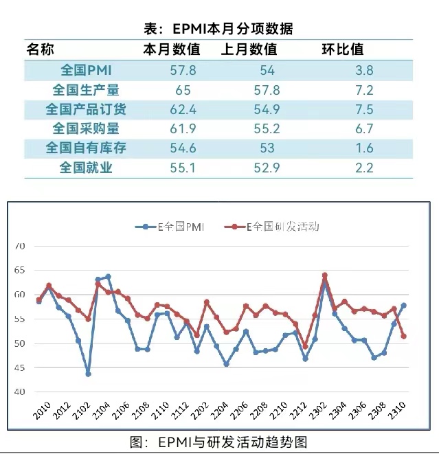 具體觀察各項(xiàng)指標(biāo),PMI指標(biāo)為57.8%,比上月回升3.8個(gè)百分點(diǎn)。生產(chǎn)量指標(biāo)為65%,比上月回升7.2個(gè)百分點(diǎn)。產(chǎn)品訂貨指標(biāo)為62.4%,比上月回升7.5個(gè)百分點(diǎn)。進(jìn)口指標(biāo)為51%,比上月回升5.2個(gè)百分點(diǎn)。自有庫存指標(biāo)為54.6%,比上月回升1.6個(gè)百分點(diǎn)。就業(yè)指標(biāo)為55.1%,比上月回升2.2個(gè)百分點(diǎn)。