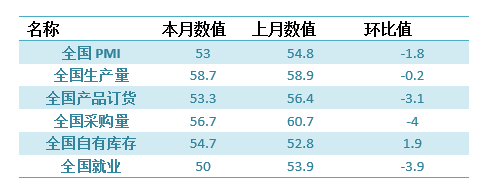 具體觀察各項(xiàng)指標(biāo),PMI指標(biāo)為53%,比上月回落1.8個(gè)百分點(diǎn)。生產(chǎn)量指標(biāo)為58.7%,比上月回落0.2個(gè)百分點(diǎn)。產(chǎn)品訂貨指標(biāo)為53.3%,比上月回落3.1個(gè)百分點(diǎn)。進(jìn)口指標(biāo)為49.6%,比上月回落3.7個(gè)百分點(diǎn)。自有庫(kù)存指標(biāo)為54.7%,比上月回升1.9個(gè)百分點(diǎn)。就業(yè)指標(biāo)為50%,比上月回落3.9個(gè)百分點(diǎn)。