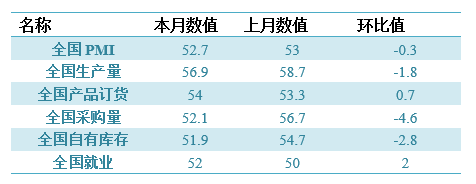 具體觀(guān)察各項(xiàng)指標(biāo),PMI指標(biāo)為52.7%,比上月回落0.3個(gè)百分點(diǎn)。生產(chǎn)量指標(biāo)為56.9%,比上月回落1.8個(gè)百分點(diǎn)。產(chǎn)品訂貨指標(biāo)為54%,比上月回升0.7個(gè)百分點(diǎn)。進(jìn)口指標(biāo)為49.6%,與上月持平自有庫(kù)存指標(biāo)為51.9%,比上月回落2.8個(gè)百分點(diǎn)。就業(yè)指標(biāo)為52%,比上月回升2個(gè)百分點(diǎn)。