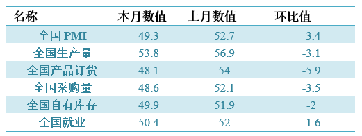 具體觀察各項指標(biāo),PMI指標(biāo)為49.3%,比上月回落3.4個百分點。生產(chǎn)量指標(biāo)為53.8%,比上月回落3.1個百分點。產(chǎn)品訂貨指標(biāo)為48.1%,比上月回落5.9個百分點。進(jìn)口指標(biāo)為48.4%,比上月回落1.2個百分點。自有庫存指標(biāo)為49.9%,比上月回落2個百分點。就業(yè)指標(biāo)為50.4%,比上月回落1.6個百分點。